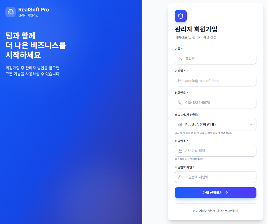 회원가입 후 승인대기상태가 되며, 관리자 승인 후에 로그인이 가능합니다.