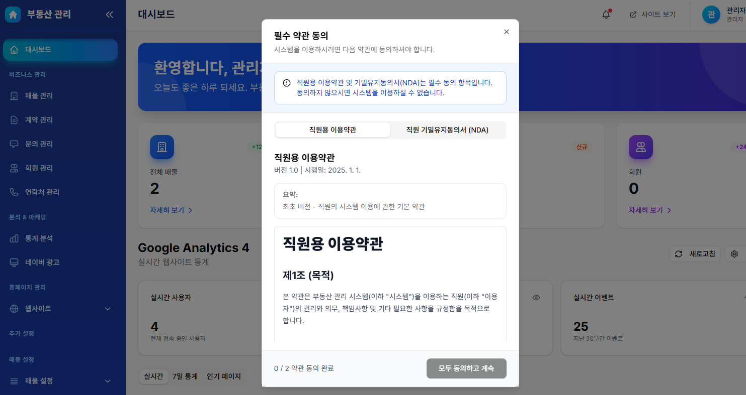 관리자 로그인시 필수 약관에 동의해야 관리자 시스템을 사용할 수 있습니다.